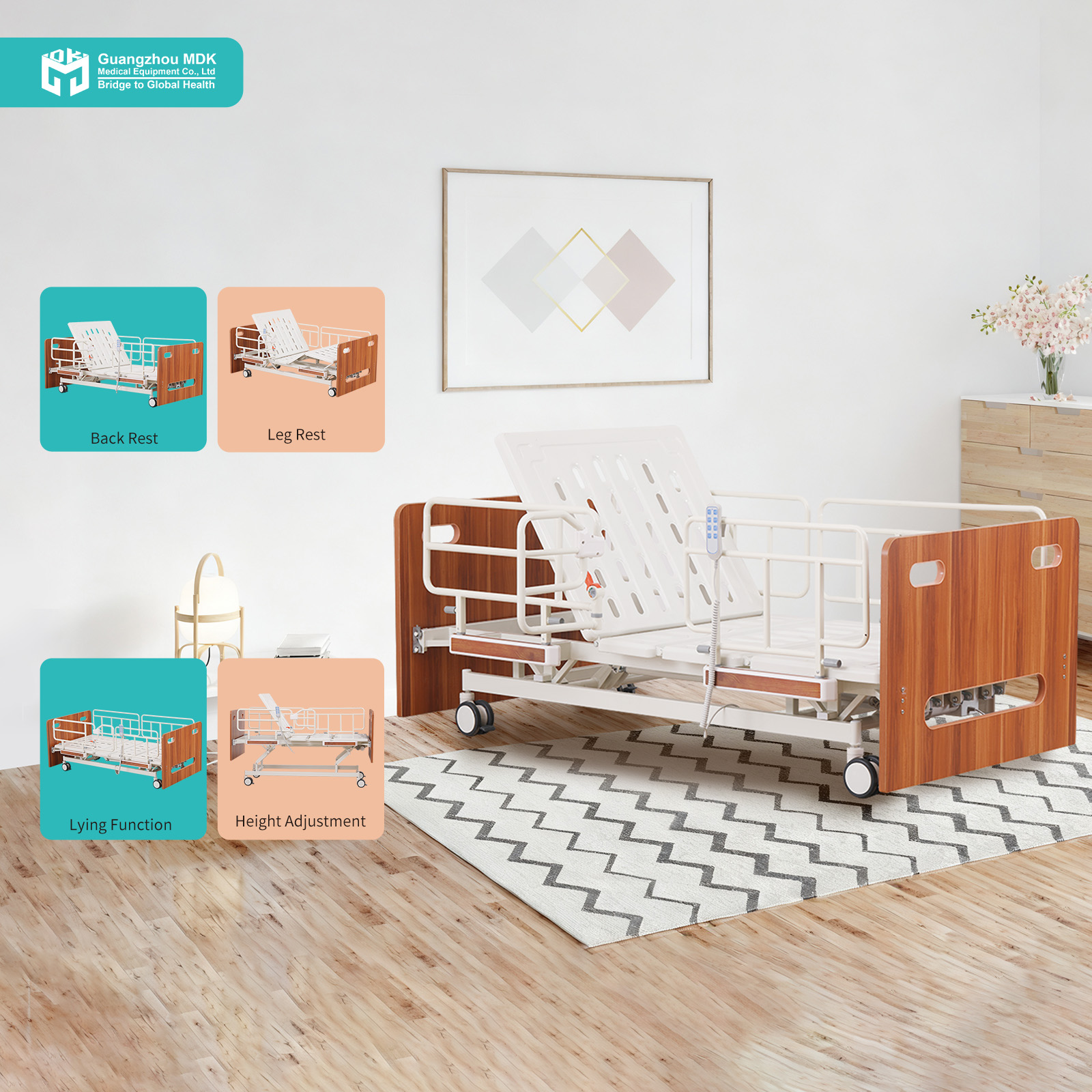 This advanced electric 3-function nursing bed perfectly combines reliable medical positioning with a warm residential design. Powered by a premium Jieshun motor system, it features a heavy-duty carbon steel frame treated with rigorous acid washing and electrostatic powder coating for ultimate anti-peeling resistance. Complete with identically sized elegant wooden head and foot boards, dual-bearing casters, and highly functional rotary iron guardrails that actively assist patients in standing and turning, it is an ideal solution for home care and rehabilitation.