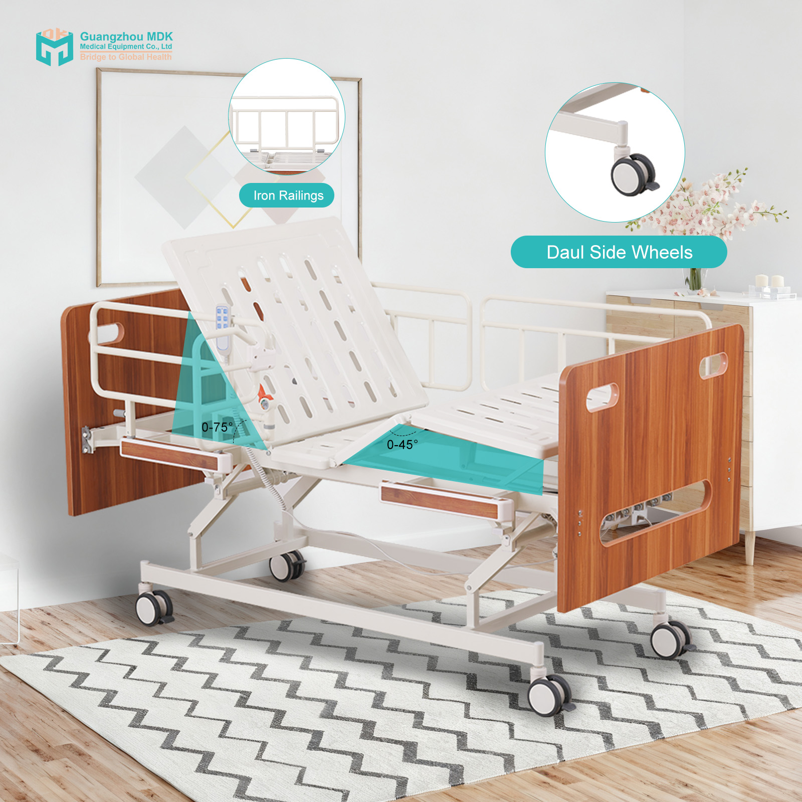 Electric 3 Function Nursing Bed with Wooden Boards and Iron Guardrails