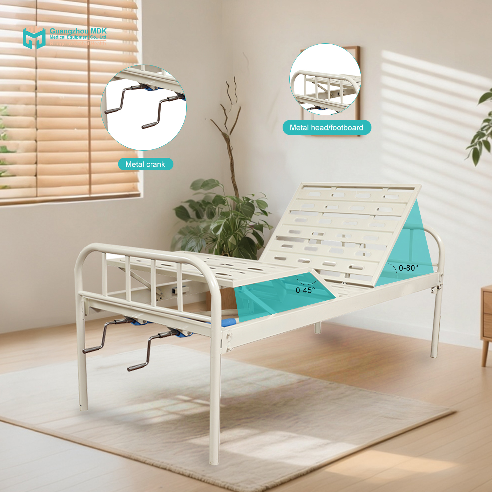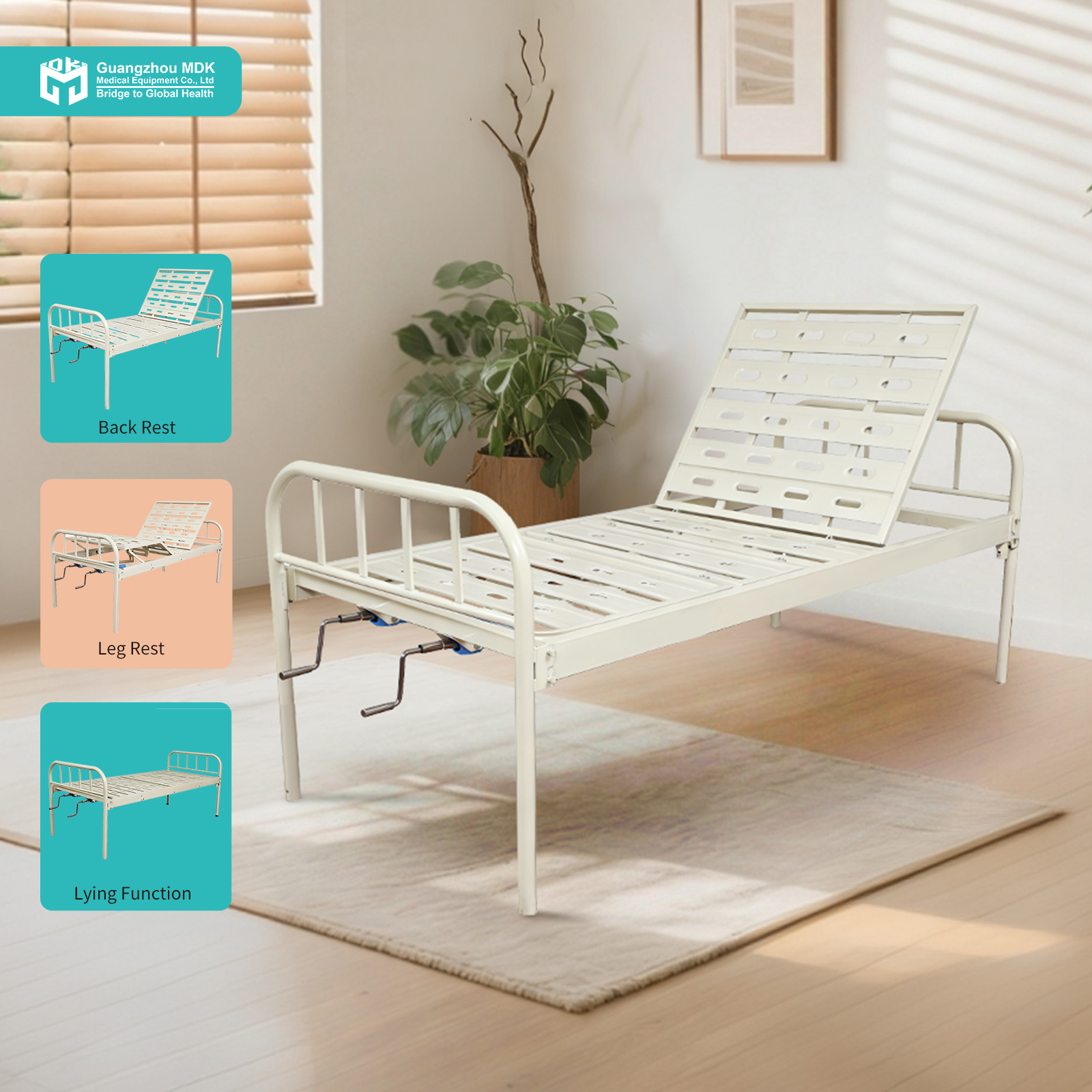 Designed for pure simplicity and extreme durability, this manual 2-function nursing bed features two robust iron cranks. Caregivers can easily adjust the patient’s backrest from 0 to 80° and leg elevation from 0 to 45°. This essential adjustability enhances patient comfort and improves blood circulation without the need for electricity, making it an ideal, cost-effective solution for basic clinics, home care, and medical facilities requiring a highly stable resting platform.