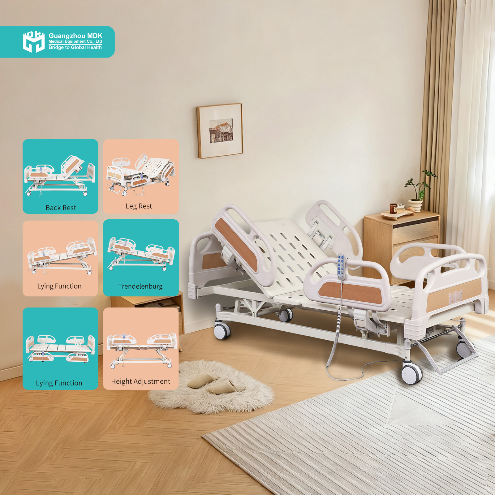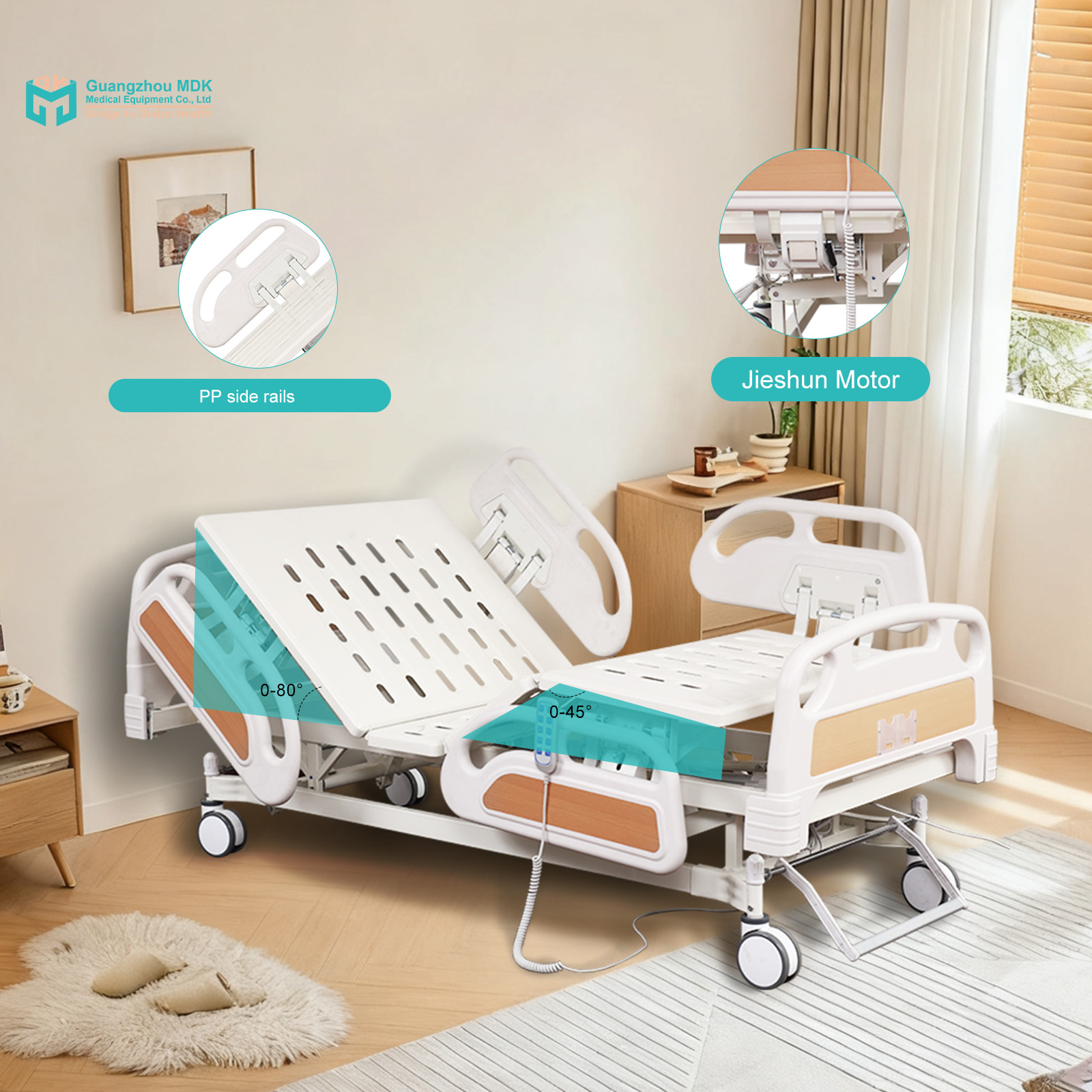 This premium electric 5-function nursing bed offers comprehensive patient positioning powered by a reliable Jieshun 1-to-4 motor system. Built on a heavy-duty carbon steel frame with a 1.0mm integrally punched plate, the entire structure undergoes strict acid washing and electrostatic powder coating for ultimate anti-peeling and rust resistance. Complete with a 4-piece PP semi-enclosed guardrail system, anti-collision head/foot boards, and 5-inch central locking casters for superior mobility and facility safety.