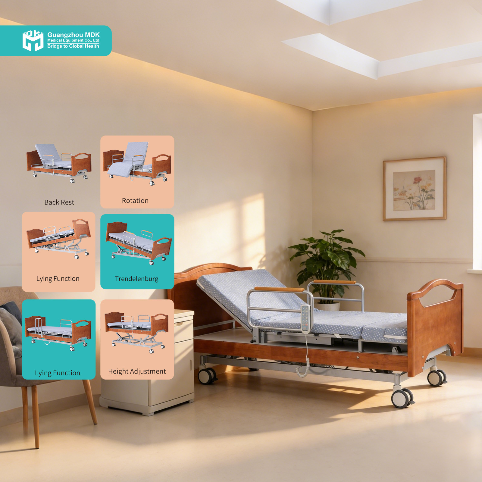 Designed to bridge the gap between hospital capability and home comfort, this electric 5-function bed features an advanced rotation system. Caregivers can effortlessly rotate the bed surface, transforming it into a chair-like position to assist patients with limited mobility in getting in and out of bed. It also provides essential positioning including backrest (0-85°), leg elevation (0-40°), height adjustment, and Trendelenburg/Reverse Trendelenburg (0-12°). (Note: A minimum clearance of 400mm from the wall is required for safe rotation).