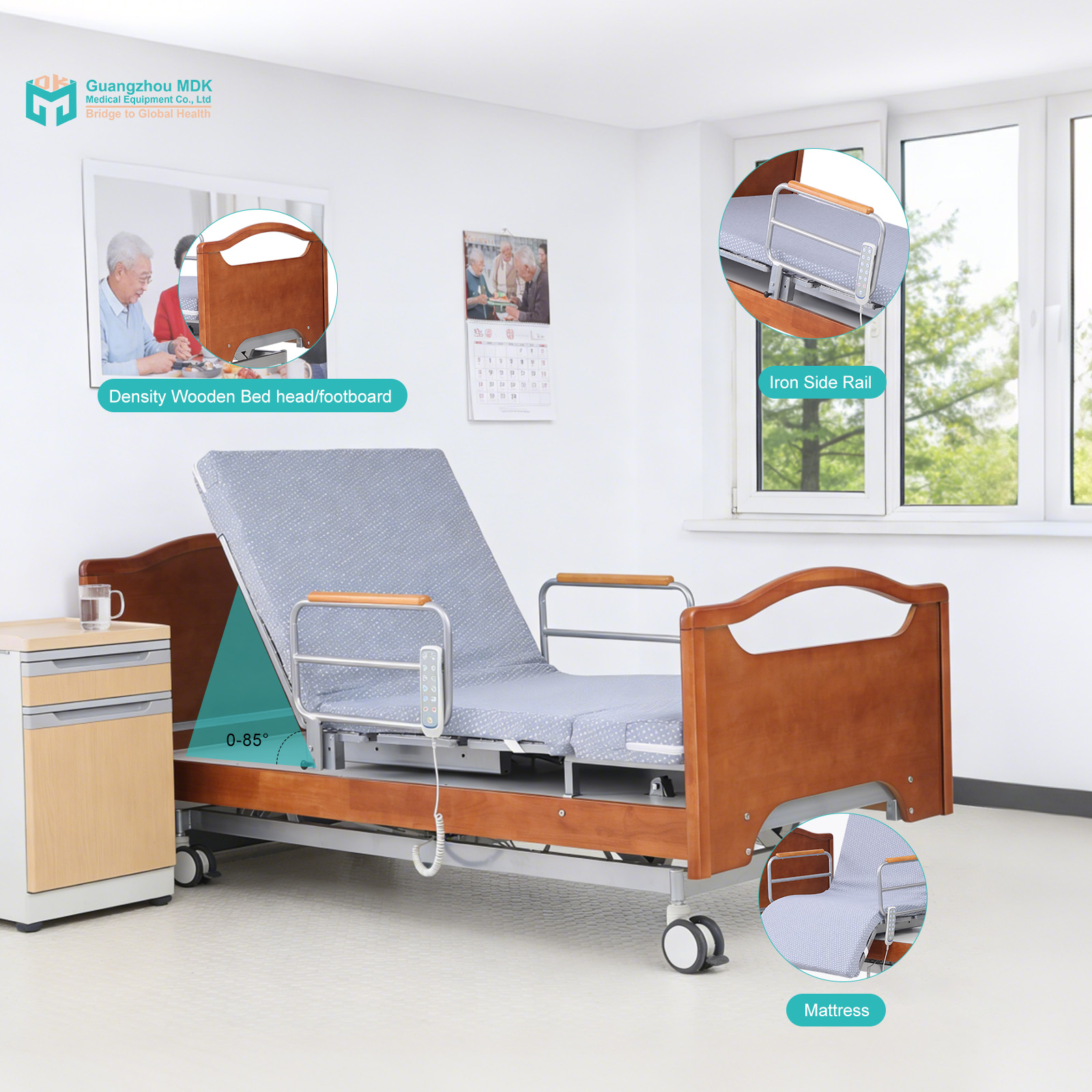 This innovative electric 5-function rotating nursing bed is designed for premium home care and rehabilitation. It features a unique rotation mechanism to assist patients in getting out of bed safely. Built on a robust carbon steel frame treated with strict acid washing and electrostatic powder coating for ultimate anti-peeling resistance. Complete with elegant wooden head/footboards, sturdy iron guardrails, a dedicated mattress, and braked dual casters, it perfectly combines medical-grade functionality with a warm, home-like aesthetic.