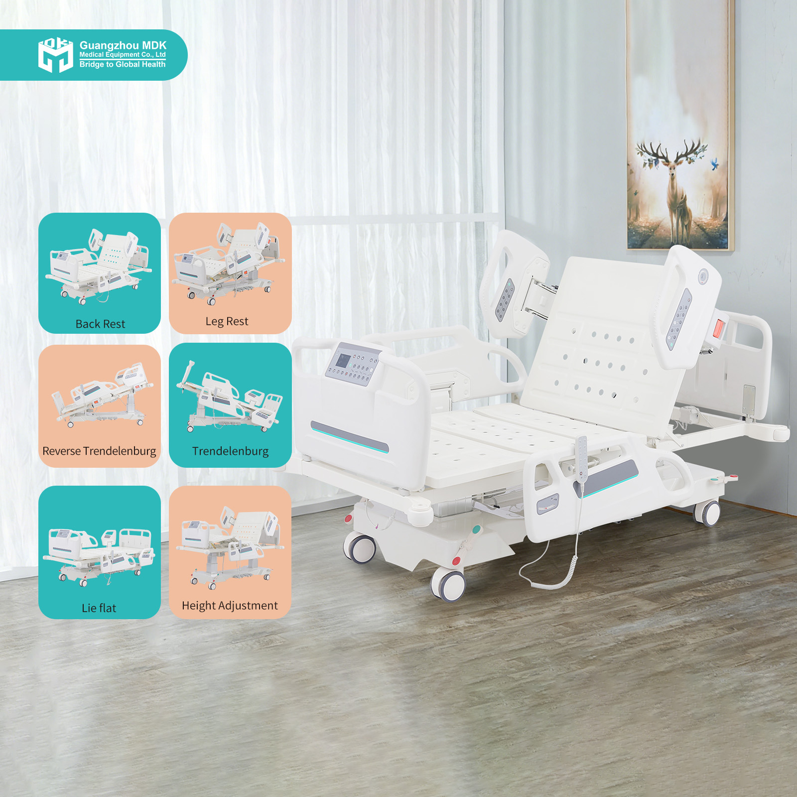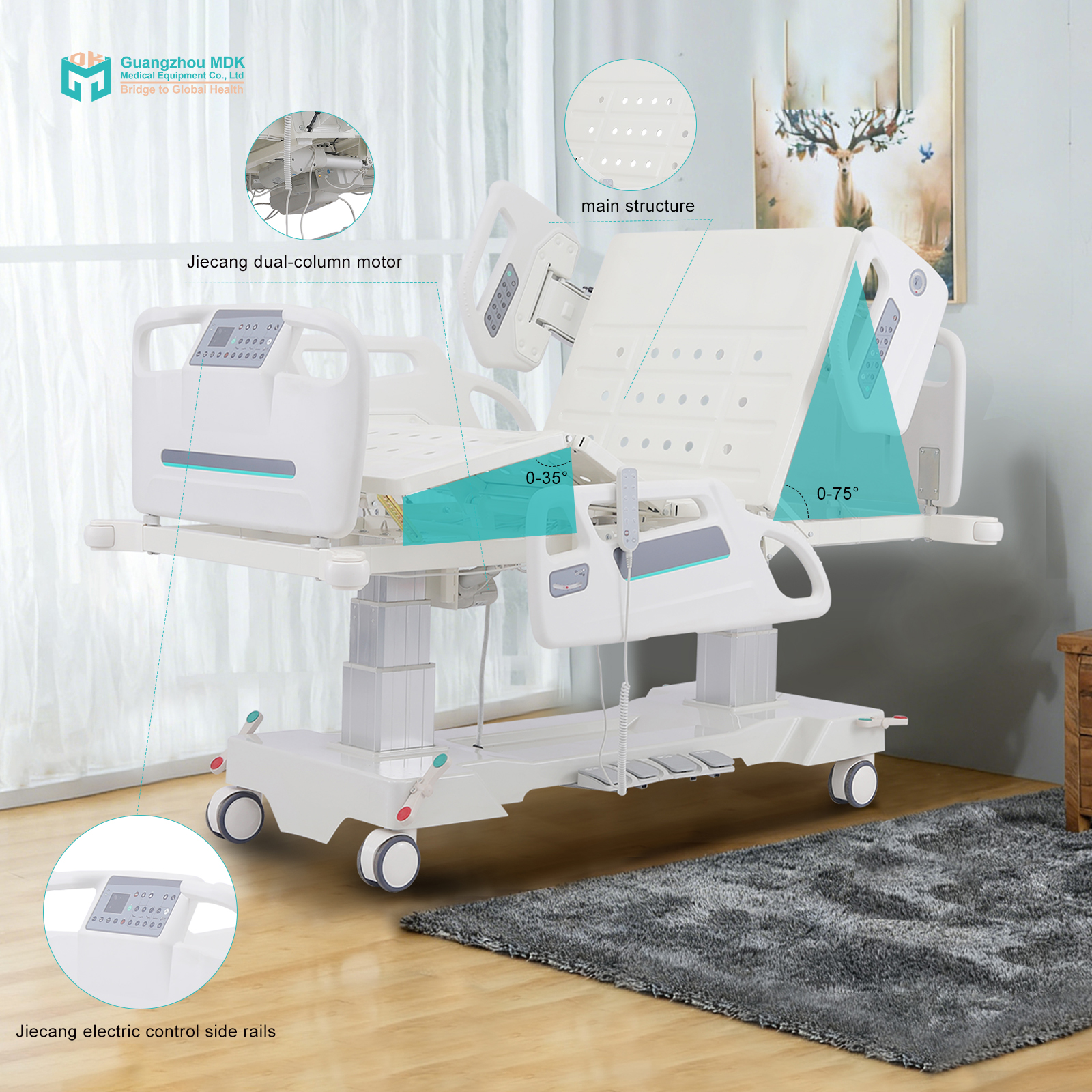 Engineered for critical care environments, this premium ICU bed utilizes an innovative two-column lifting design. Powered by a top-tier Jiechang motor system (with foot pedal and battery backup), it offers complete 7-function adjustability: Backrest (0-75°), Leg elevation (0-35°), Trendelenburg/Reverse Trendelenburg (15°), Left/Right Lateral Tilt (20°), and overall height adjustment (555-885mm). This comprehensive positioning capability is crucial for intensive care, pulmonary therapies, and easing caregiver strain.
