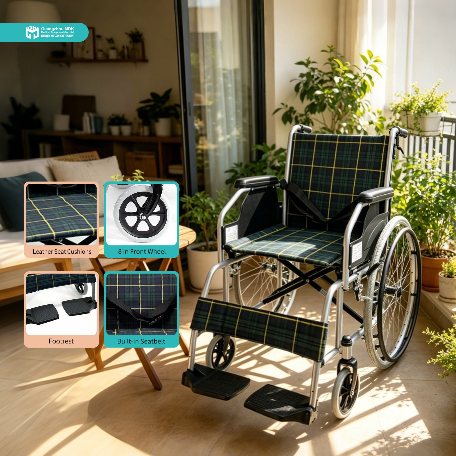 Patient comfort and safety are paramount. The seating area (46cm width, 40cm depth) and 38cm high backrest are made from high-quality leather, reinforced with an inner 600D canvas layer to prevent stretching and ensure high tensile strength. For smooth navigation, the wheelchair is equipped with 8-inch (20cm) PVC front wheels and 24-inch (60cm) maintenance-free solid rear tires. Safety is further enhanced by the toggle-type brake device, specifically designed to sit below the seat surface when locked for unobstructed transfers.