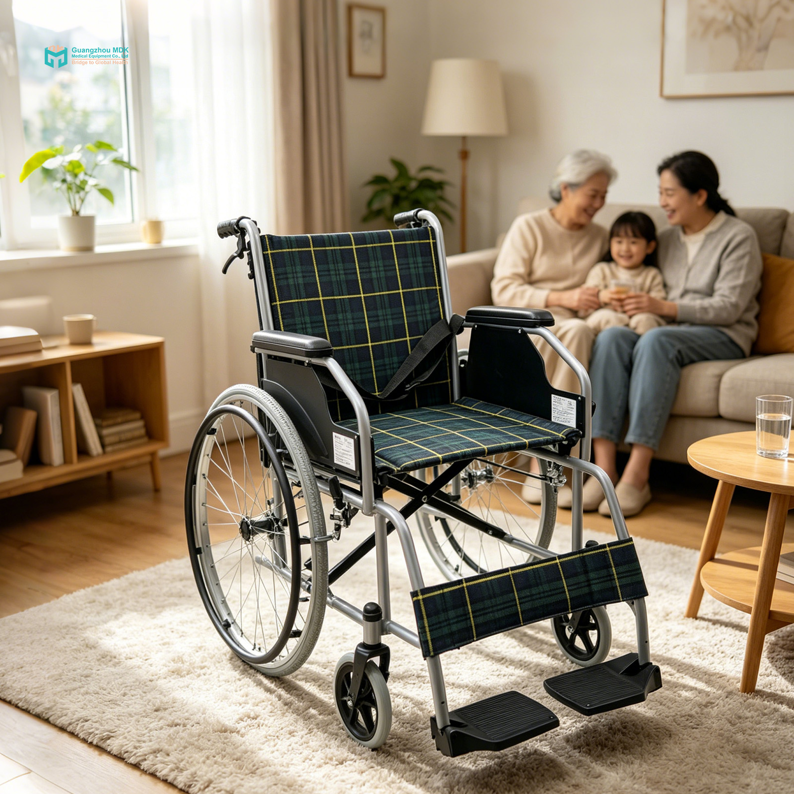 This model is designed for stability and practicality, featuring fixed slanted armrests that provide solid support while allowing the wheelchair to be positioned closer to tables or desks. The fixed footrests are paired with upgraded aluminum alloy footplates, which offer far superior impact resistance and durability than standard materials. This combination ensures the wheelchair remains low-maintenance and highly reliable in both home and facility environments.