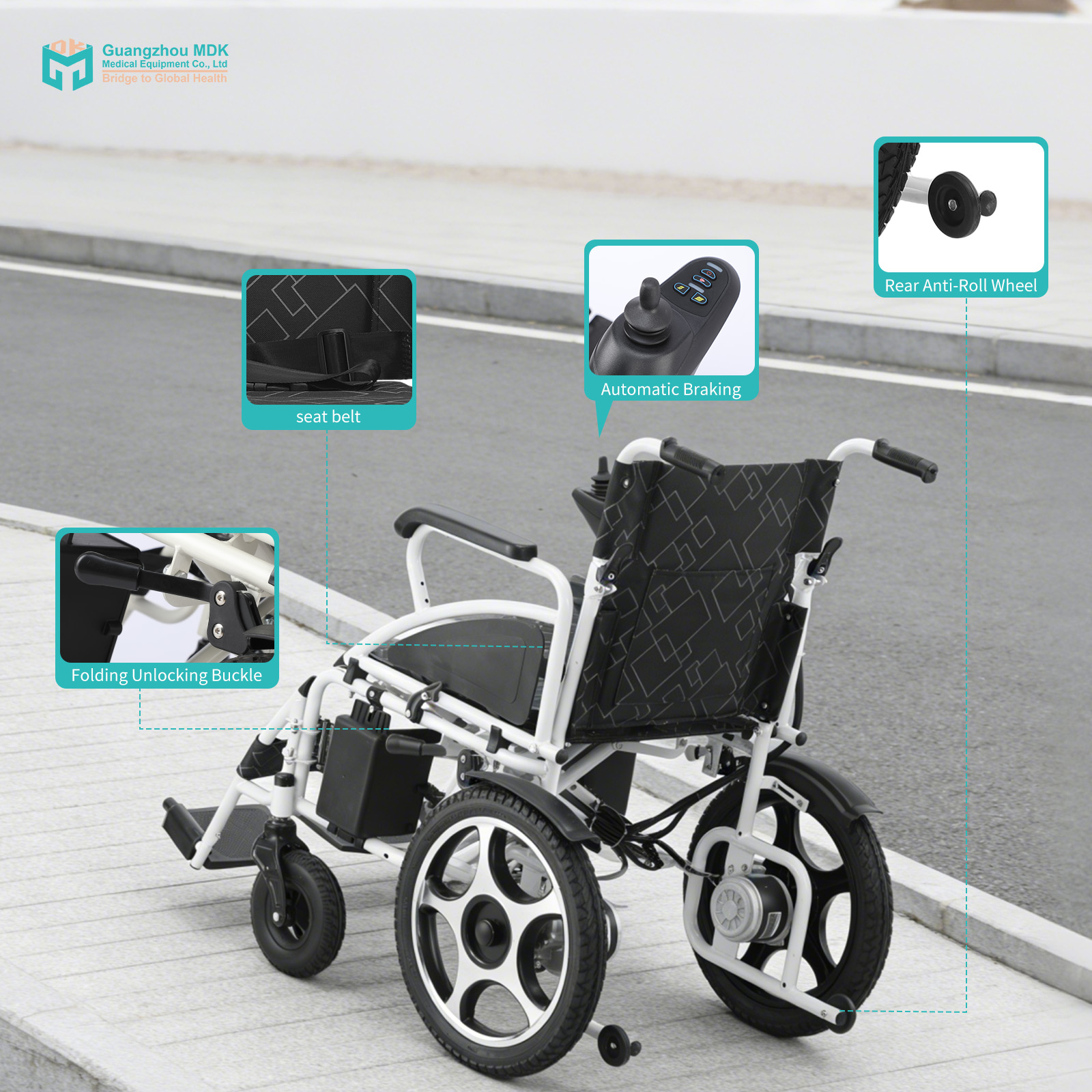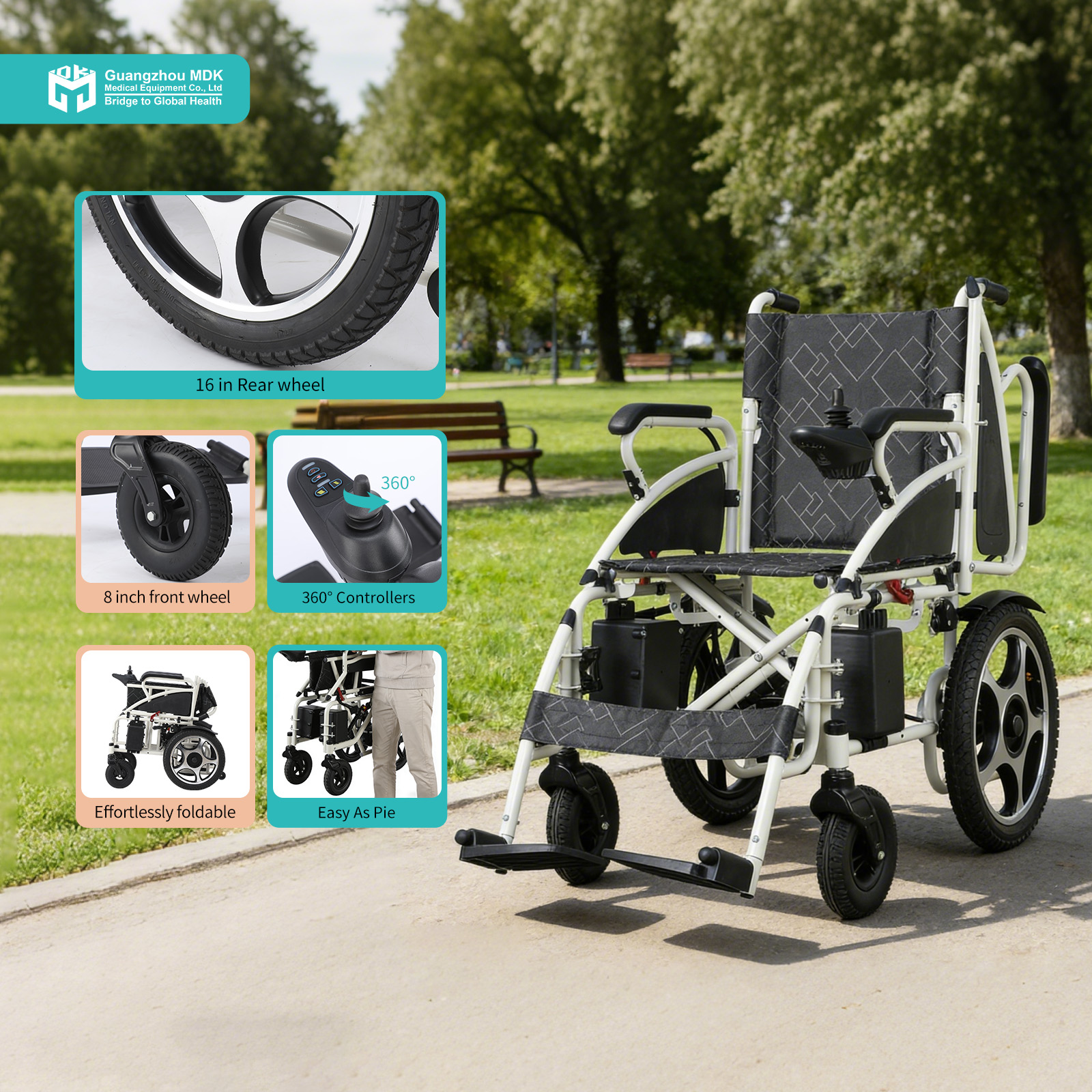 This highly reliable standard electric wheelchair is built for everyday mobility and outdoor adaptability. Constructed on a heavy-duty carbon steel frame, it delivers exceptional structural strength and durability. Powered by a 250W motor and equipped with an intuitive 360° smart controller, it ensures smooth and effortless navigation. The standout feature is its 16-inch large rear wheels, designed to tackle various terrains with ease. Complete with a quick-fold mechanism, a 12A lead-acid battery (20A optional), and a 100KG weight capacity, it is the perfect practical solution for daily travel.