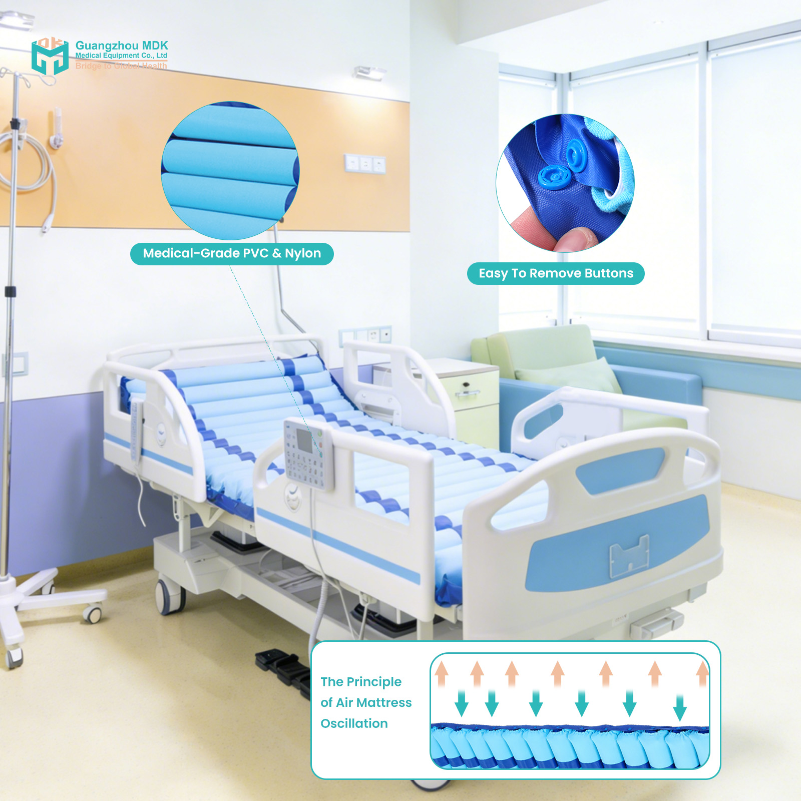 Durability and hygiene are paramount in medical care. The mattress is manufactured using a composite of high-quality PVC and Nylon fabric with a robust thickness of 32 silk (0.32mm). The entire surface features uniform, flat, and securely heat-sealed joints, ensuring it is 100% waterproof, odor-free, and exceptionally easy to sanitize. Furthermore, the micro-hole ventilation design (Jet/Breathable feature) helps dissipate body heat and moisture, keeping the patient’s skin dry and comfortable.